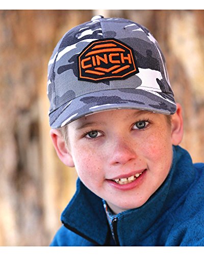 Product DescriptionA cowboy is never too young to wear many hats This Flexfit Cinch cap features a super-cool grey camo pattern and a bright orange embroidered logo patch on the front.0