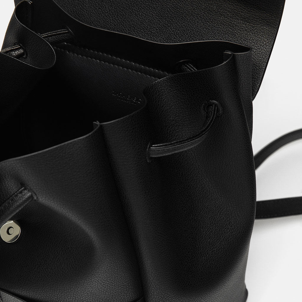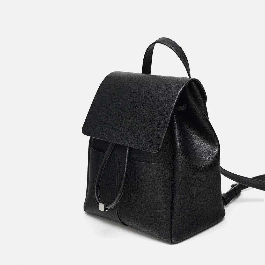 黑色背包。提手及可调式肩带。通过褶皱与磁扣闭合。