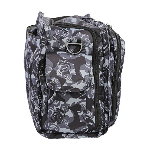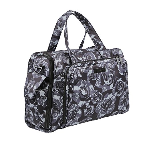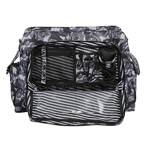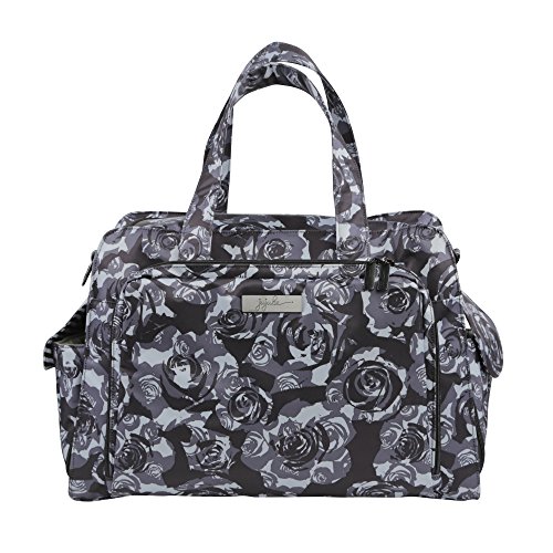 The Ju-Ju-Be Onyx Collection Be Prepared Diaper Bag is a smart bag with innovative designs and spacious compartments. Keep yourself ultra-organized with (17) friendly pockets that make it easy to tote along all your daily essentials. Are you an over packer? Do you have more than one in diapers? Twins? How about the perfect bag for overnight trips or the airplane? The largest in our line of diaper bags, the Be Prepared will help you be just that, prepared. The lining is protected with an Again natural antimicrobial treatment that inhibits and reduces the growth of odor-causing bacteria, mold and mildew. The outer fabric is treated with Teflon fabric protector, making it easy to repel stains and keep it clean. The "mommy" pocket is large enough for smartphones, wallets, keys and other personal items. Inside are (4) pockets with a sunglass holder and a key fob stretch cord. A snap closure pocket is located on the front of the bag and ideal for books. The main zipper pocket is large enough for diapers, wipes, extra clothes and other items. This spacious area also includes (7) smaller pockets with (2) sets of colored tabs to help distinguish different items. The back pocket is designed with crumb drains to keep this area clean and includes a super cushy memory foam changing pad. Bottle pockets with magnetic closure flaps are located on either side of the bag and insulated to keep items hot or cold. This bag is machine washable and measures 18.5-inches by 14-inches by 6.5-inches in size. The Black Petals print is a grey floral pattern on a black background with white and black stripes for the lining. The print is accented by black, metal hardware. All Ju-Ju-Be Bags come with a Lifetime Limited Warranty against manufacturing defects when purchased from an Authorized Ju-Ju-Be Dealer. Authorized Dealers can be found in the images.Feature