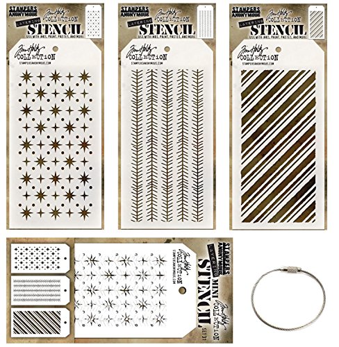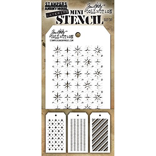 Tim Holtz Mini Layering Stencil Set #31 includes 3 Tag-shaped mini stencils measuring 3 1/8" x 6 1/4"