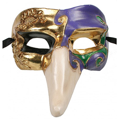This long-nosed Pulcinella paper mache mask is decorated with embossed metallic gold-colored designs & painted in Mardi Gras colors; purple, green, gold (with black) - Measures 7"W x 4"H; Secures with two black ribbon ties on back. Can be used for professional stage acts, but it is also a good mask for a masquerade ball, a costume party, Mardi Gras, Venetian carnival or even Halloween!