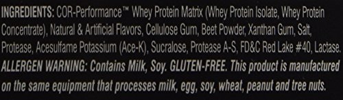 MORE PROTEIN, BETTER FLAVOR; Cellucor COR-Performance Whey was created with one goal in mind-to deliver a pure protein that packs more protein, and better flavors, into each and every scoop. COR-Performance Whey features a fast digesting Whey Protein Isolate based formula that packs 25G of protein per serving to satisfy protein needs any time of day. Featuring 100% Whey Protein, minimal fat or carbs, added digestive enzymes, perfect mixability and the best flavors on the market, it's safe to say COR-Performance Whey is here to set the new standard in protein.FLAVOR SCIENCE. COR-Performance Whey utilizes some of the most advanced flavor systems available to deliver imaginative, delicious protein flavors that everyone will crave. Sticking to a regimen of exercise and proper nutrition can be tough. Everyone, from rookie to all-star, from novice lifter to seasoned bodybuilder can struggle to get enough protein in their diet. COR-Performance Whey makes it easy to meet your daily protein goals, packing 25G of pure whey protein per scoop, in a wide variety of flavors so you get results, not bored. Mixes Instantly. COR-Performance Whey has been formulated to dissolve instantly in water, milk, or your other beverage of choice.Feature