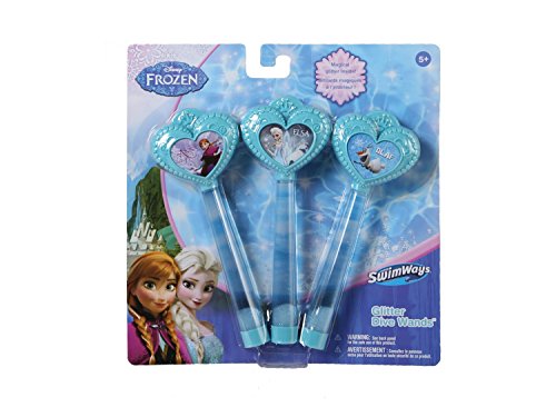 -. Binding : Toy -. Brand : SwimWays -. Color : multi-colored -. EAN : 0795861253428 -. Feature : Disney Frozen Glitter Dive Wands are kids dive sticks with magical glitter inside! / Great for learn to dive retrieval and role-playing games / Fun party favors for your next Disney Frozen birthday party / Three characters styles included per pack: Elsa, Anna and Olaf / For Ages 5+ -. IsAdultProduct : 0 -. ItemPartNumber : 25342 -. Label : SwimWays -. LegalDisclaimer : Always keep children in sight within quick and easy reach when they are in the water. -. Manufacturer : SwimWays -. Model : 25342 -. MPN : 25342 -. NumberOfItems : 1 -. PackageQuantity : 1 -. PartNumber : 25342 -. ProductGroup : Toy -. ProductTypeName : TOYS_AND_GAMES -. Publisher : SwimWays -. Size : 8" -. Studio : SwimWays -. Title : Swimways Frozen Glitter Dive Wands -. UPC : 785239768241 -. Warranty : No Warranty