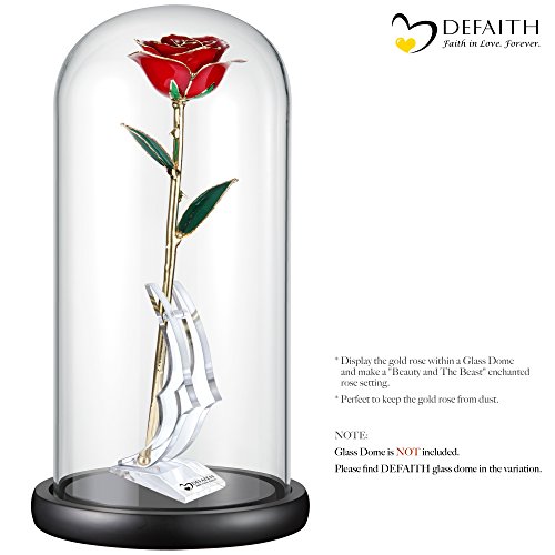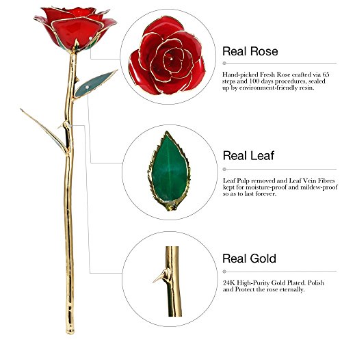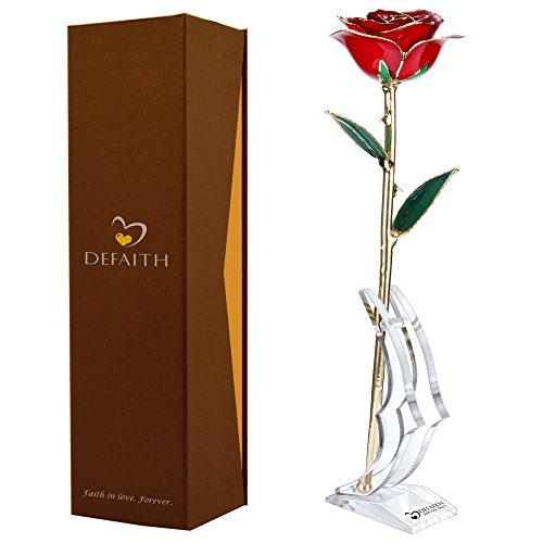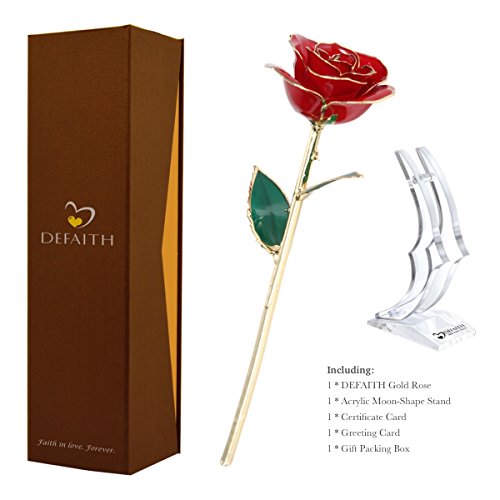 Red Gold Rose, DEFAITH 24K Gold Trimmed Long Stem Real Rose with Moon-shape Rose Stand. Last a Lifetime. Best Anniversary Gift.
