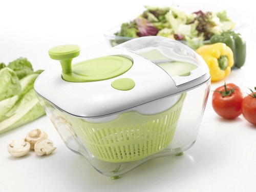 - Cost efficient with multipurpose pieces; spinning basket doubles as colander, clear base doubles as serving bowl