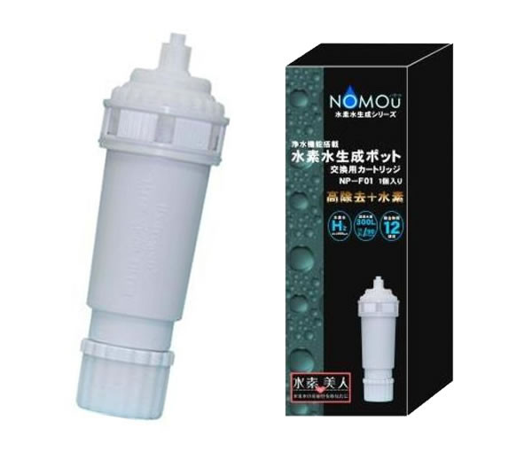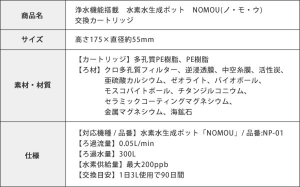 | 仕様 | 【対応機種】水素水生成ポット「NOMOU」、品番:NP-01 【ろ過流量】0.05L/min 【ろ過水量】300L 【水素供給量】最大200ppb 【交換目安】1日3L使用で90日間 |