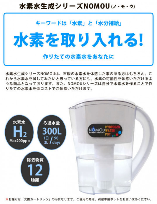 | 「水素水」を手軽に低コストで始められる水素水生成ポット「NOMOU」専用交換カートリッジ。 |
