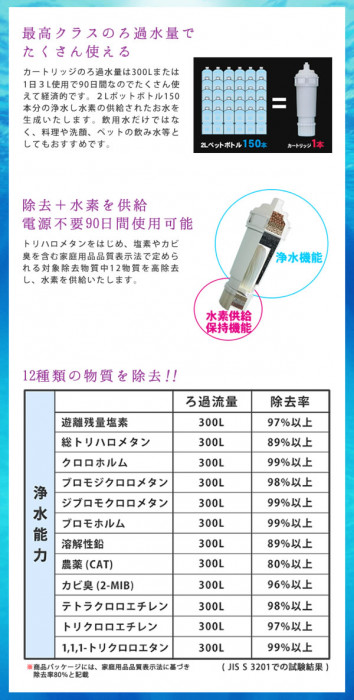 | 素材・材質 | 【カートリッジ】多孔質PE樹脂、PE樹脂 【ろ材】クロ多孔質フィルター、逆浸透膜、中空糸膜、活性炭、亜硫酸カルシウム、ゼオライト、バイオボール、モスコバイトボール、セラミックコーティングマグネシウム、チタンジルコニウム、金属マグネシウム、海鉱石 |