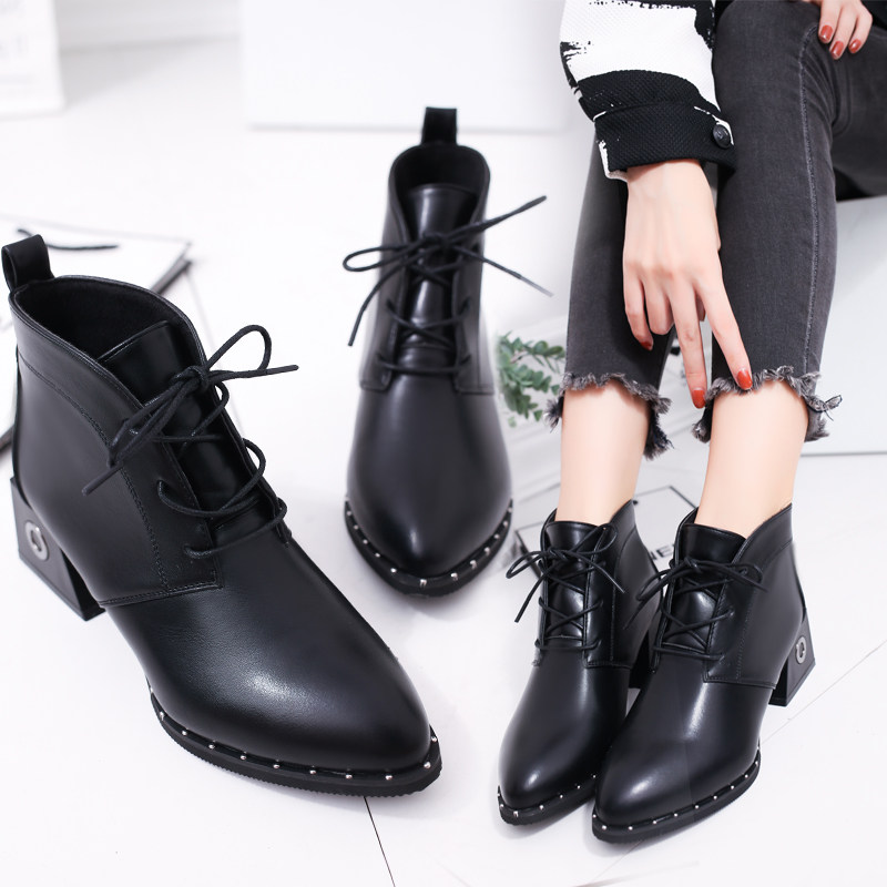 新款秋冬马丁靴女英伦风短靴尖头鞋粗跟靴子百搭系带中跟裸靴