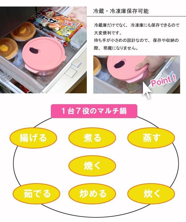 | 1台7役!揚げる、煮る、蒸す、焼く、茹でる、炒める、炊くがこれ1つで可能です。電子レンジ、直火、保温・保冷、冷凍、食洗機、オーブンに対応しています。軽いから持ち運びにも便利!料理研究家のおすすめ料理レシピ付きです。 |