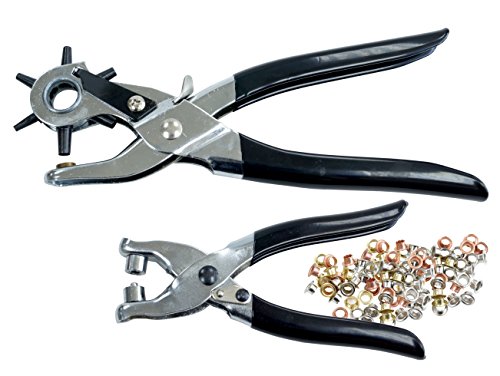 -. Feature : Lochzange mit 6 Aufsätzen von 2,5 bis 5 mm / Nietenzange für Nieten bis 5 mm / Inkl. 100 Nieten in 3 verschiedenen Farben: Bronze, Silber & Gold