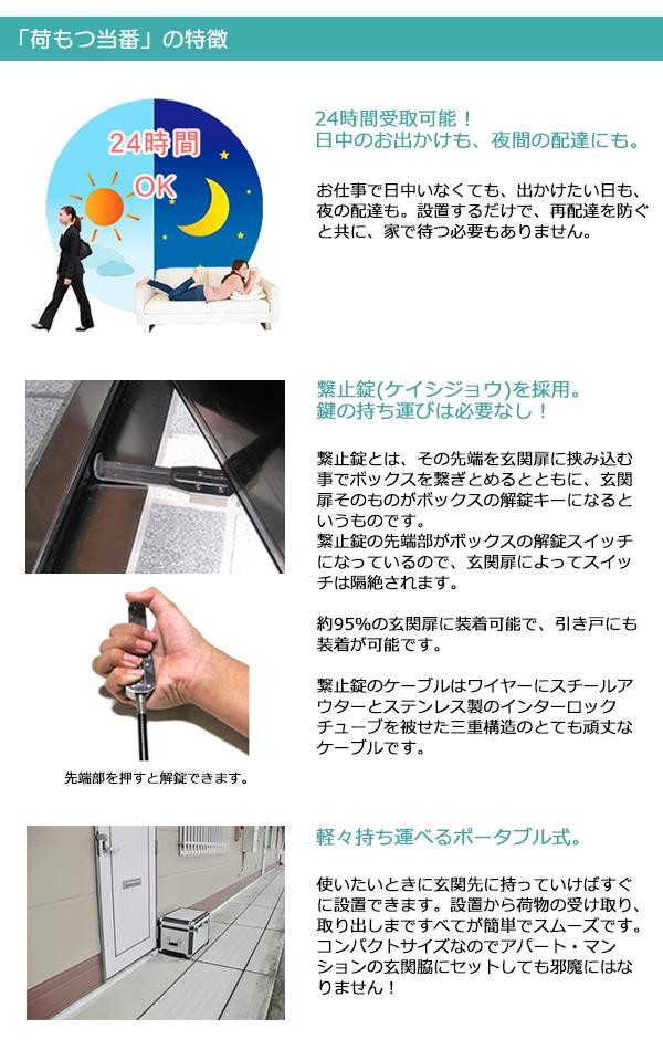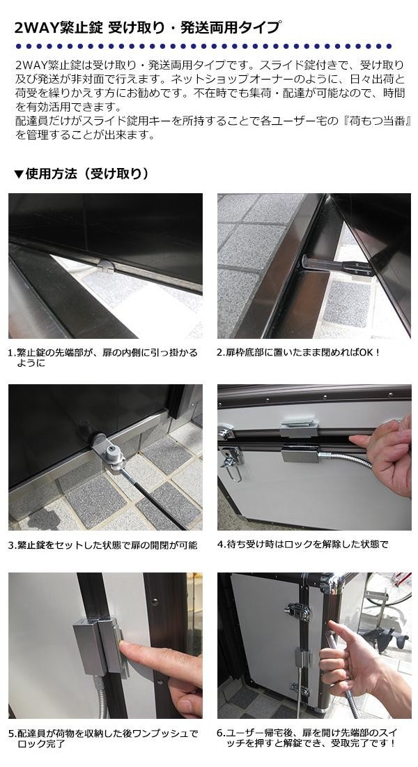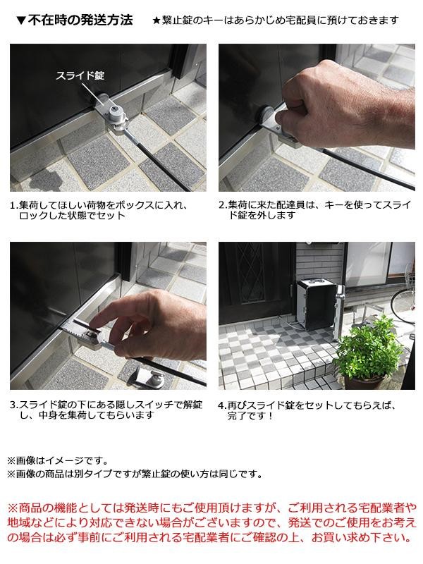 | 付属品 | スライド錠用キー×2、ユーザー用取扱説明書、配達員用説明書シート |