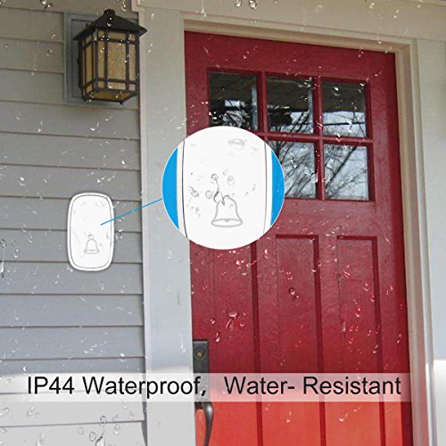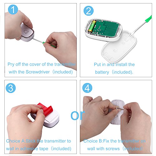 - Easy Installation - The doorbell receiver doesn't require any mounting or batteries,just plug the receiver into an electrical outlet,the push button transmitter can be fixed to the front door with the provided screws,or stick it to the door with provided adhesive tapes.The push button transmitter is IP44 Waterproof Grade for outdoor use