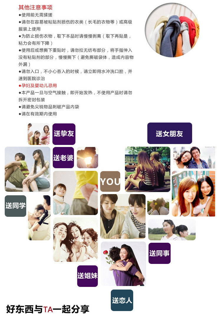 请妥善保管产品,避免使暖身宝的真空塑料包装袋破坏,造成药物泄露。