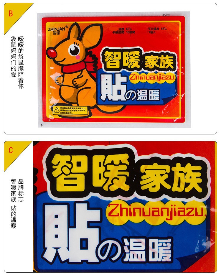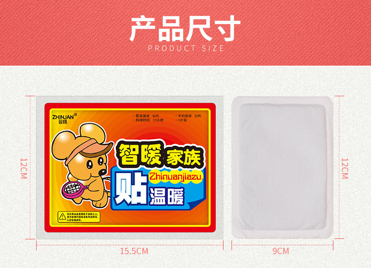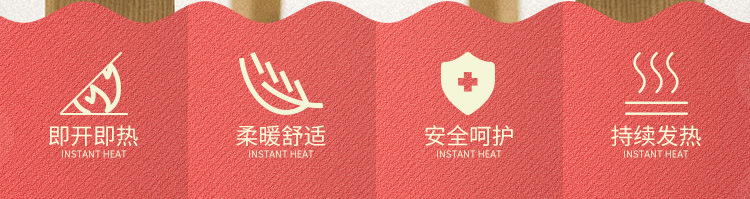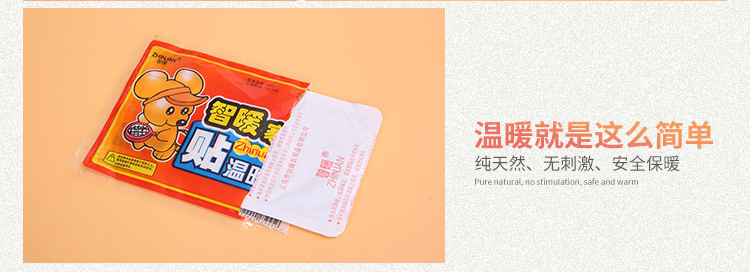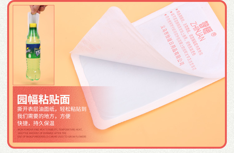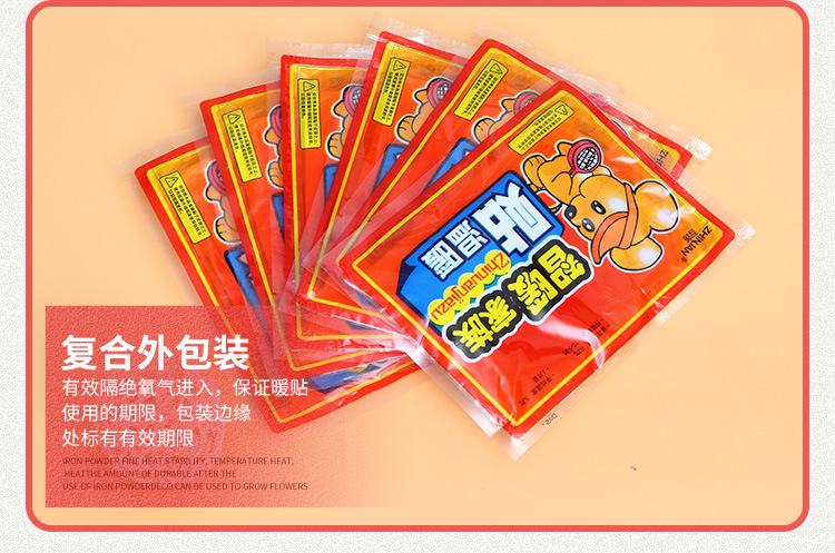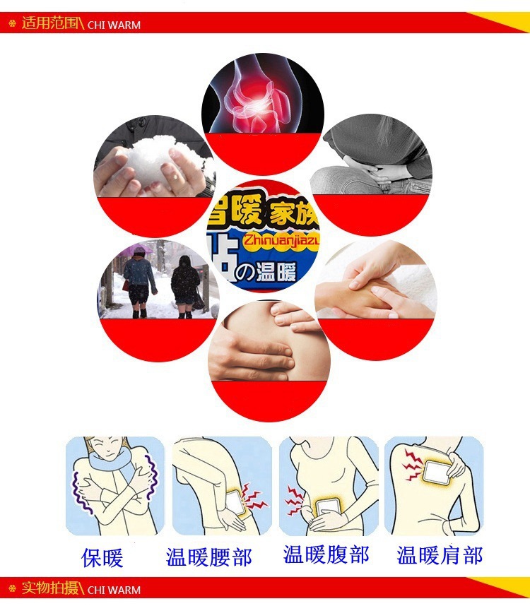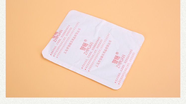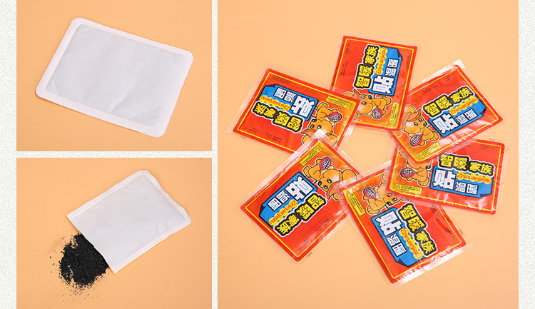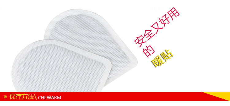 (2)撕开外袋,取出内袋,不需揉搓,将剥离后面的衬纸,贴在内衣外层,用手铺平即可。几分钟后即自动升温至40℃以上,可贴在腰、腹、肩、膝等处。不宜直接贴于人体皮肤上
