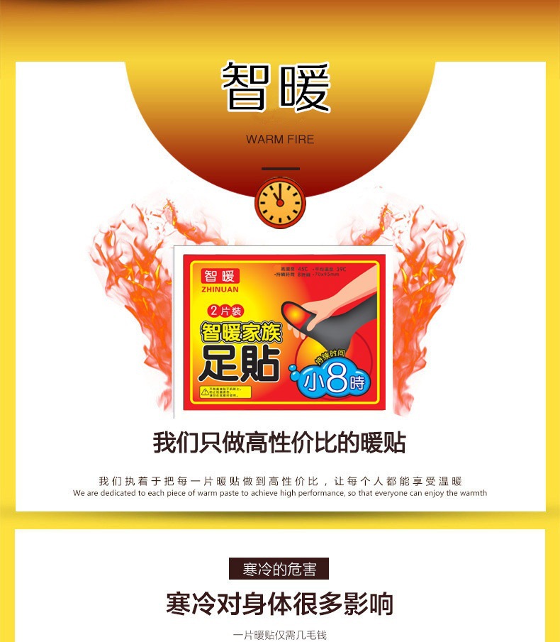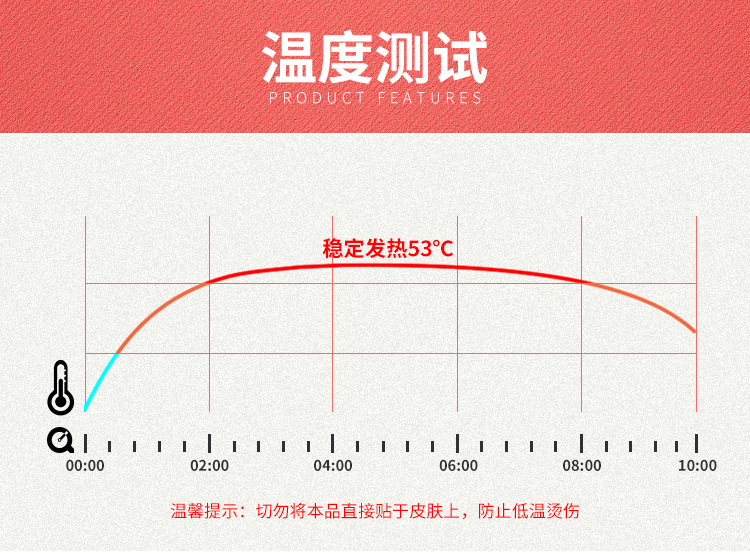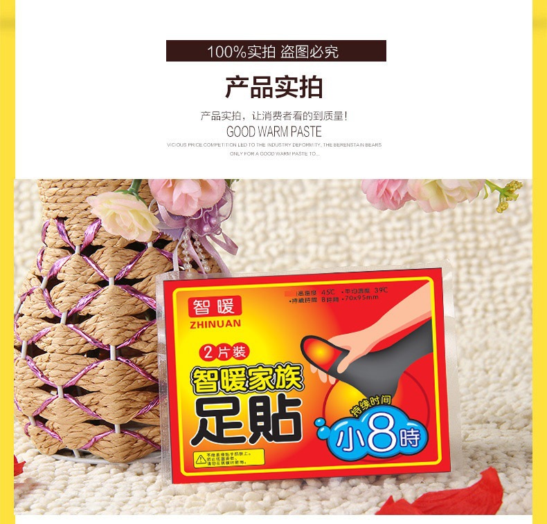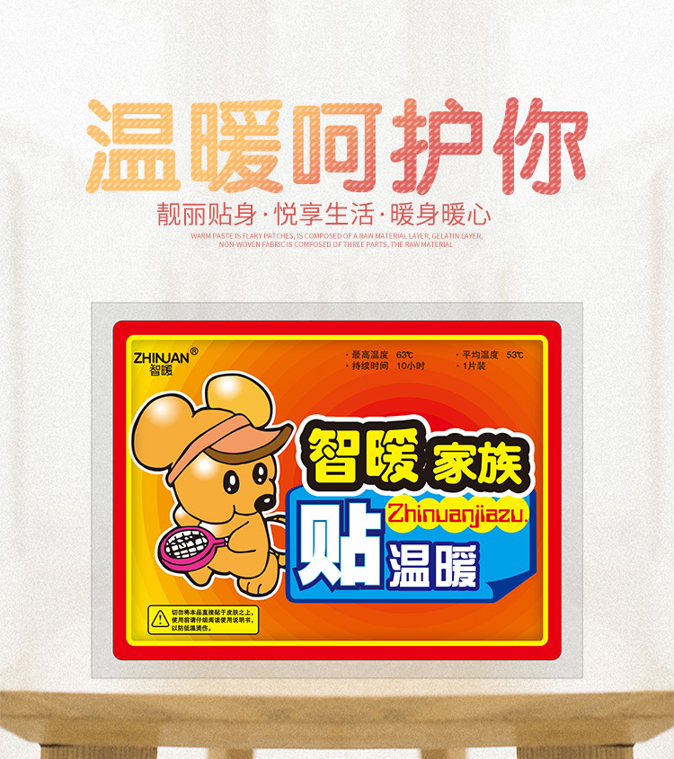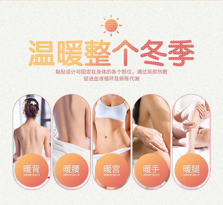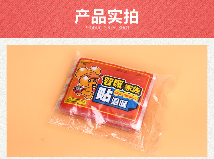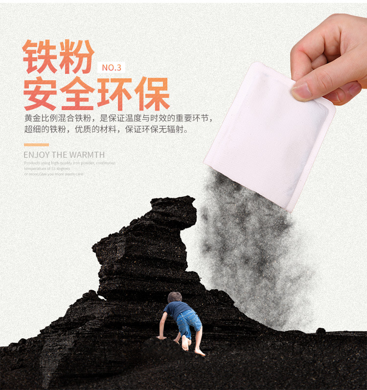 (2)撕开外袋,取出内袋,不需揉搓,将剥离后面的衬纸,贴在内衣外层,用手铺平即可。几分钟后即自动升温至40℃以上,可贴在腰、腹、肩、膝等处。不宜直接贴于人体皮肤上