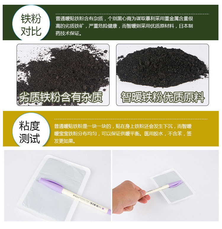 该品为片状贴剂,是由原料层、明胶层、无纺布袋三部分组成的,原料层置于无纺布袋内,明胶层用于使一贴热粘附在衣服上。原料层是由铁、石、活性炭、无机盐、水等合成的聚合物,可在空气中氧气的作用下发生放热反应。无纺布袋的特点是均匀不污损衣物。