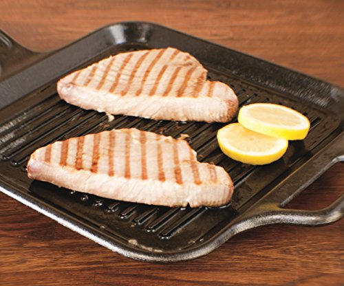 -. Feature : 12-inch pre-seasoned cast-iron square grill pan; raised ridges allow fat to drain / Red cast-iron construction heats slowly and evenly / Pre-seasoned with vegetable oil formula and ready for immediate use / Long handle with hole for hanging, complemented by helper handle / Lifetime limited warranty; oven safe to 500 degrees F; hand wash with warm water only