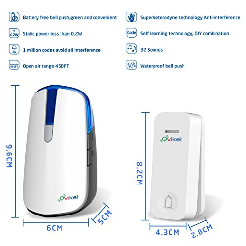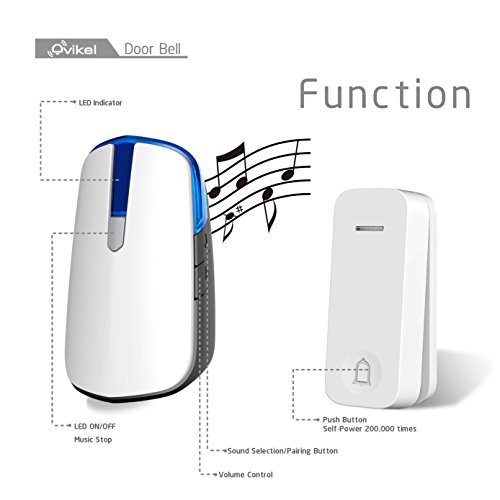 -. Title : Ovikel Waterproof Self-power Bell Push Button Wireless Doorbell,Two Pieces Of Transmitters and Wireless Plug-in Door chime,No battery required for both transmitter and receiver with LED Indicator