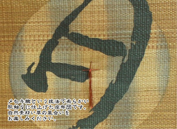 職人が1枚1枚手作業で捺染プリントを施したイ草座布団です。メセキ織という技法で柔らかい肌感触に仕上げました。またイ草の生地を縫製した後に、生地を湿らせ、裏返しにする『返し』という技法で仕上げております。イ草を通常曲げてはいけない方向に曲げますので、良い(太く強い)イ草でなければ作ることができません。返すことにより、ふっくらしたボリューム感を出しました。国産(九州産)のい草を使用しています。一本一本が太く、表皮が厚く繊維がキメ細かいので弾力性があり、耐久性に優れています。い草には空気の自然浄化作用、湿度の調節作用などがあります。また汚れにくく、使用するうちに黄金色に変化し味が出ます。い草に青森ヒバ加工を施しています(抗菌、防臭効果)。中材はウレタンをフェルトでサンドした三層構造で、適度なクッション性があります。※柄のプリントは職人が手作業で描く為、同じ色・柄であっても多少風合いが異なります。