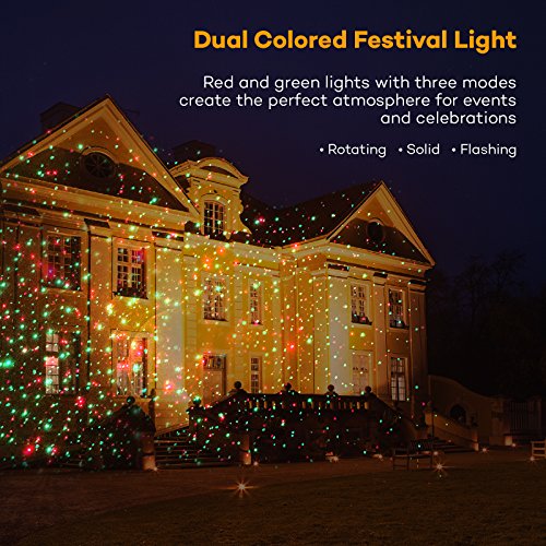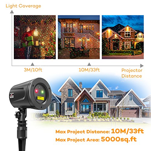 -. Feature : Beautiful Color red and Green, rotating/solid/flashing modes, help creates a perfect atmosphere. Class Ⅲ-a laser light, wavelength data red light: 0.698 mw; Green light: 0.665 mw. FCC FDA approved / Through temperatures ranging from -14.8 °F / -26 °C to 77 °F / 25°C, the laser's colored light remains strong for consistent use during extreme weather conditions / 4 handy interval timers: choose between 2, 4, 6, and 8 hour timed interval modes - the laser will work for that set interval before restarting the next day at the same time / Memory function: the light will resume the mode from the last use and restart the timer countdown, so you can always keep your favorite mode without resetting again / Wide sweeping coverage: lights a gigantic 4900 square foot range to set the mood at festivals and celebrations