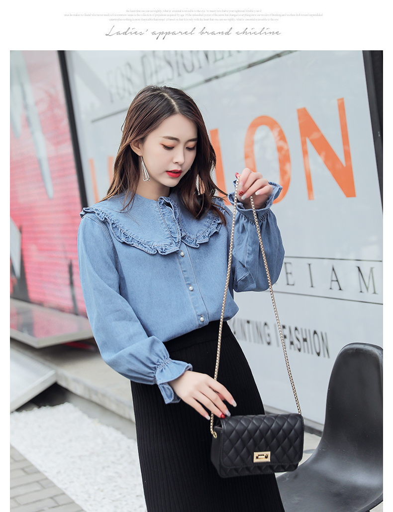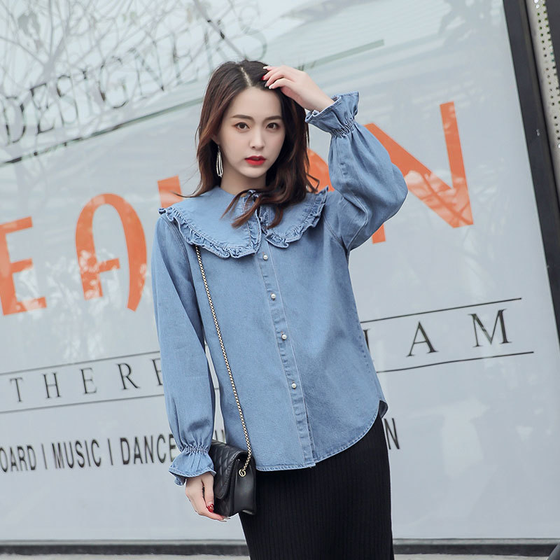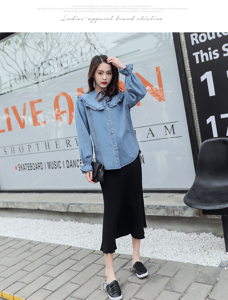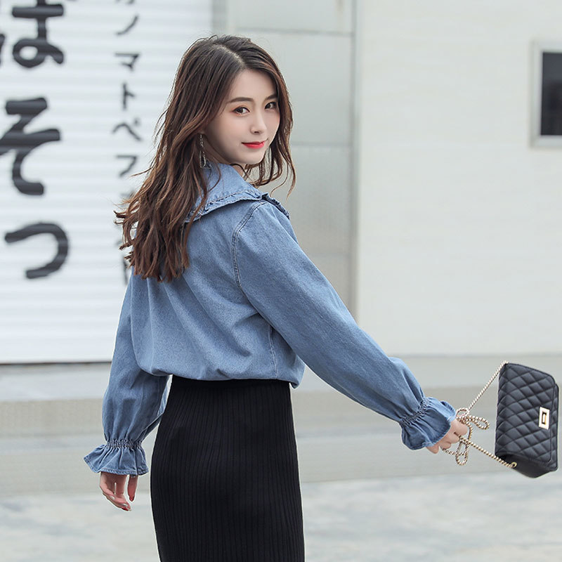 大きめの襟、フリル袖が可愛いデニムシャツ。
