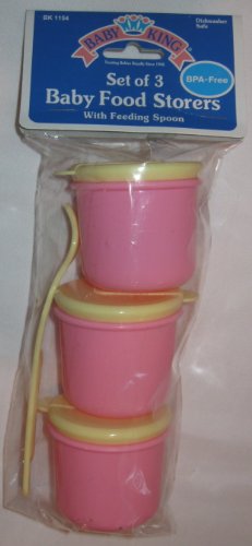 -. Binding : Baby Product -. Brand : Baby King -. EAN : 0094606011546 -. Feature : BPA-Free / Blue with light green fit tight lids / Top Rack Dishwasher safe / Do not use in microwave -. Label : Baby King -. Manufacturer : Baby King -. MPN : BK 1154 -. PackageQuantity : 3 -. PartNumber : BK 1154 -. ProductGroup : Baby Product -. ProductTypeName : BABY_PRODUCT -. Publisher : Baby King -. Studio : Baby King -. Title : Baby King Set of 3 Baby Food Storers with Feeding Spoon -. UPC : 094606011546