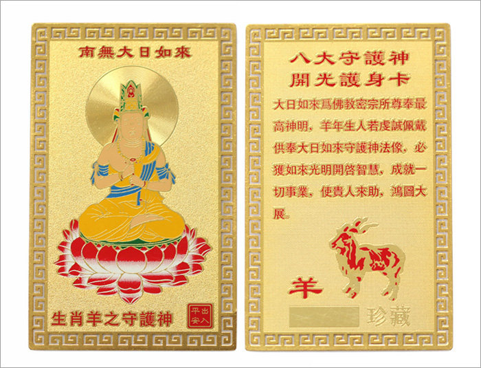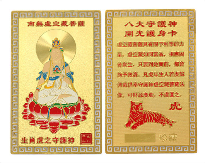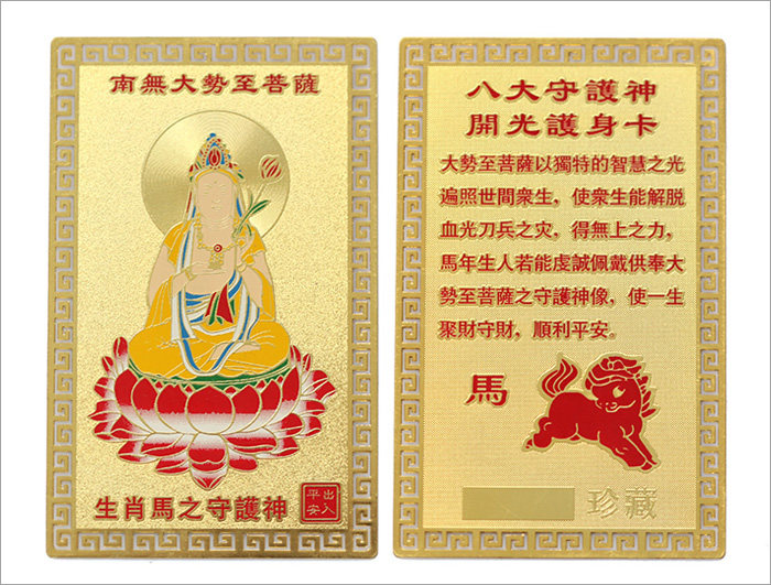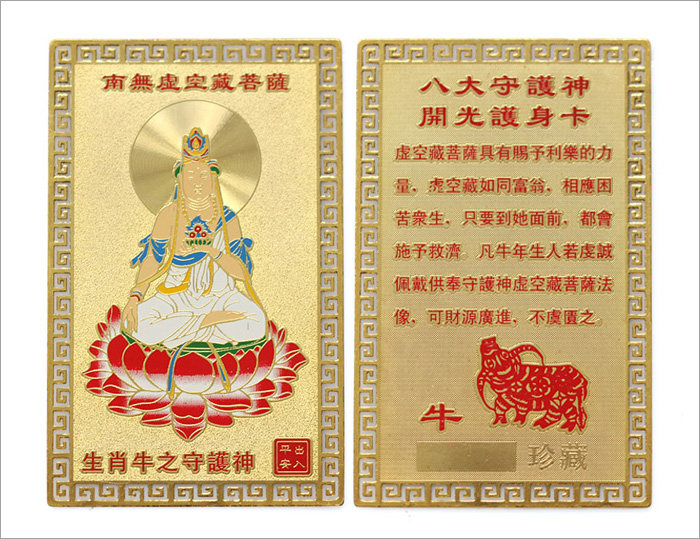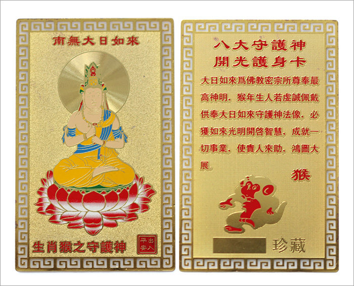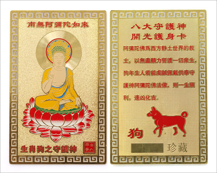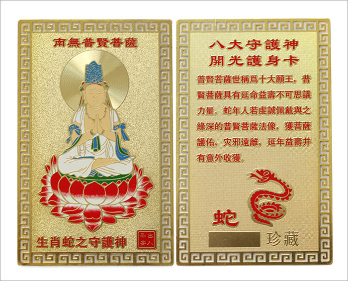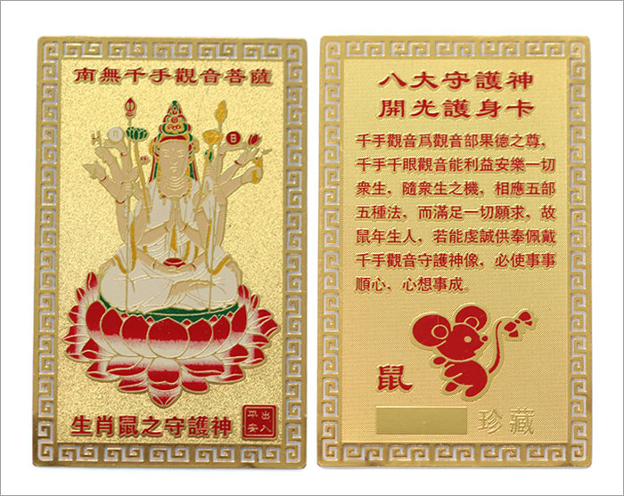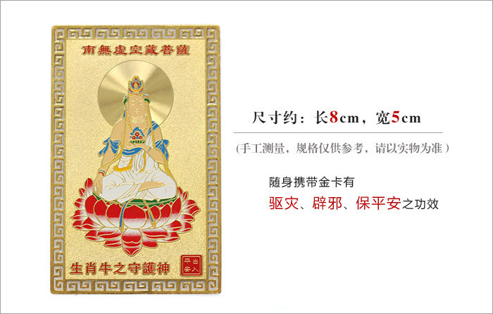产品相关介绍: 名称:护身符十二生肖金卡 材质:镀金 尺寸:约长8cm*5cm(手工测量,规格仅供参考,请以实物为准) 重量:约8G 包装:吉祥物专用包装 |