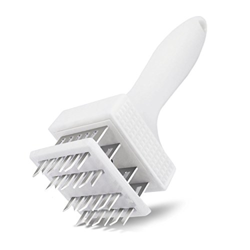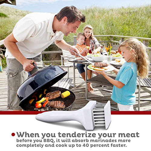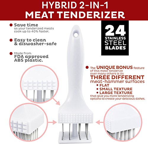 -. Feature : Save money by making less expensive cuts of beef, chicken and pork chops tender and easier to prepare for healthier meals for your family and friends. Order one now, and when you do, why not order two and get one for your best friend too! / Save time when you fry, roast or Barbeque as your favorite seasoning powder, spice, sauce or marinade infuses the treated cuts with flavor faster improving the tenderness even more. There's a link on the back of the package to FREE homemade marinade recipes. See picture six / Save time on any cut of tenderized boneless beef or chicken as it cooks up to 40% faster / Easy to clean and dishwasher safe (upper rack). Made from FDA approved ABS plastic with 24 stainless-steel blades that cut deep, even channels so marinades can soak easily into the cuts you tenderize / This versatile, hand-held, manual multi-blade and hammer hybrid unit has the added feature of three different mallet surfaces to give you more tenderizing options for creating delicious and nutritious dishes for your family and friends- see picture two