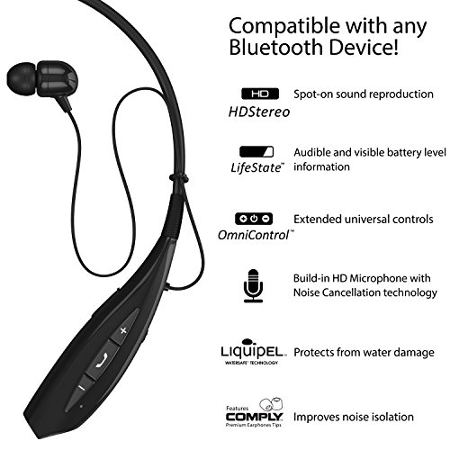Feature : HD SOUND - 10mm Speakers combined with Bluetooth 4.1 create super accurate HD sound with powerful bass. The bullet-shaped Comply T-400 M memory foam tips provide Total Isolation from external noise. / SWEAT PROOF - Say Goodbye to Water-Damage! Protected by Liquipel Nano Coating your Buds withstand sweaty workouts and will survive accidental dropping into water - Guaranteed! / MICROPHONE - The built-in microphone makes it possible to use the headset for Calls. The headset reads out the callers number when a Call comes in, and the Audio you were listening to is silenced. When you hang up, audio starts back up automatically. / VIBRATING CALL ALERT - The headset VIBRATES INDEPENDENTLY from your phone when a call comes in and reminds you even while you don't have the earbud in your ear. / LIFETIME SWEATPROOF WARRANTY - We will replace your Earbuds in case they ever get damaged by sweat! No questions asked.