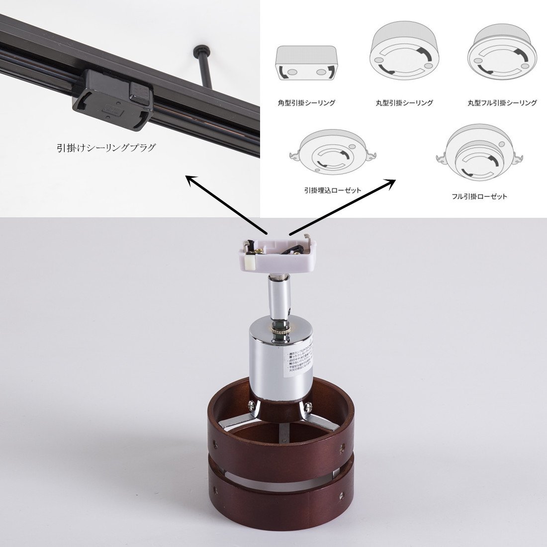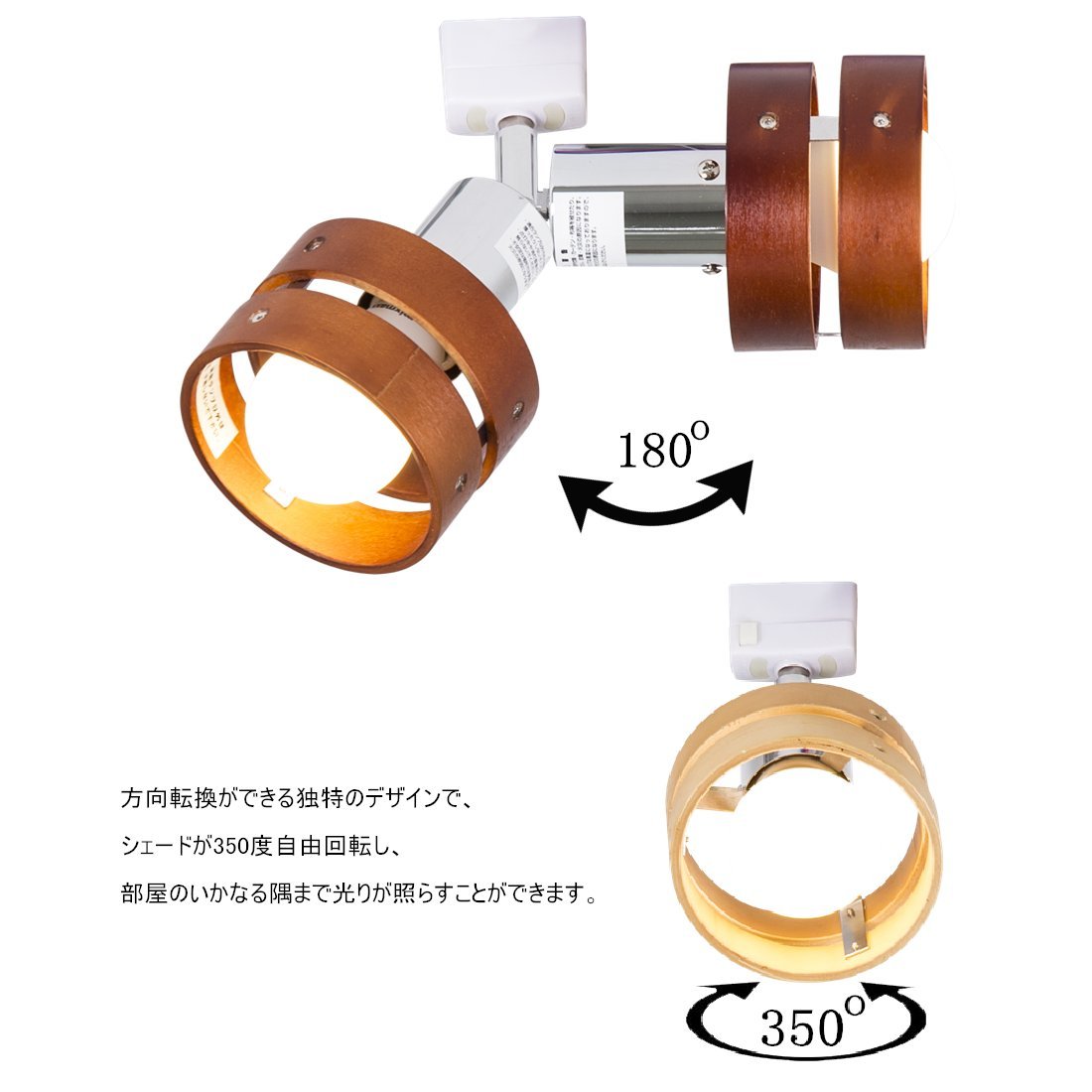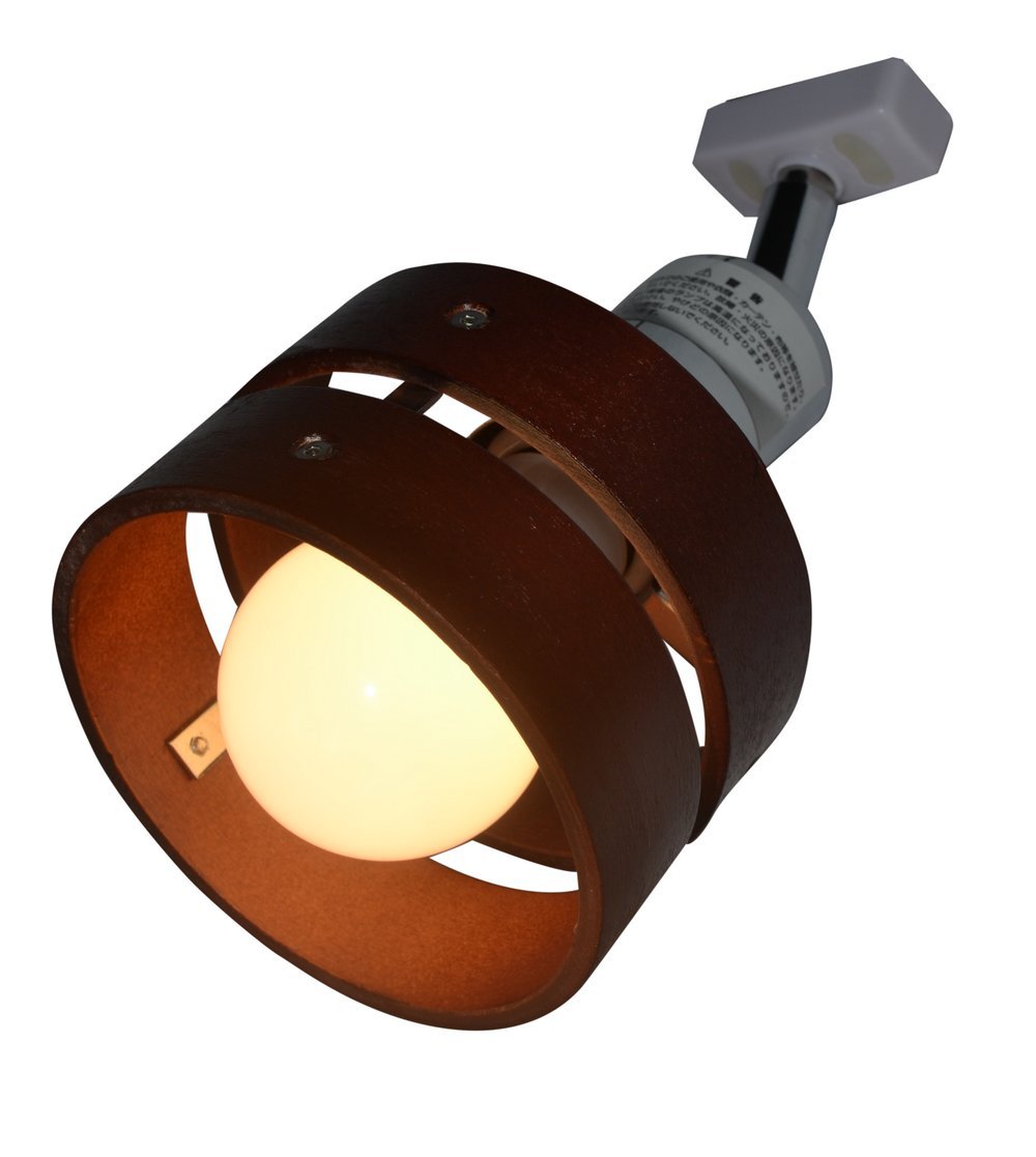■ Spot light of ceiling connection hooking, combining wooden two-piece shade with body of chrome plating.