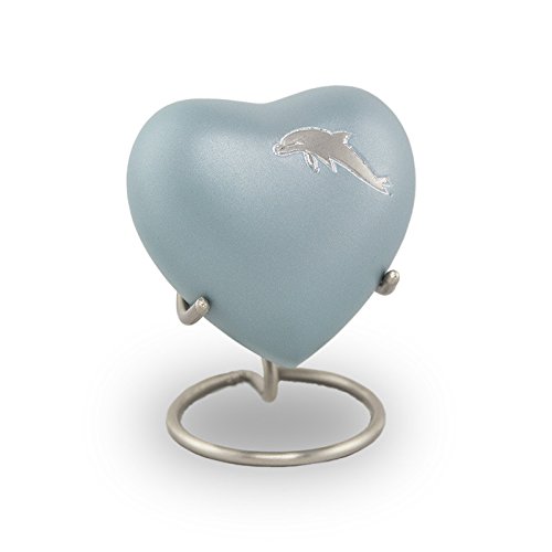 - Blue heart-shaped cremation keepsake with hand engraved dolphin accent.