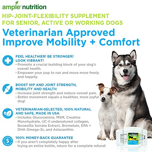 FEEL HEALTHIER! BE STRONGER! LOOK VIBRANT! Promote a crucial building block of your dog’s overall health - improve joint and cartilage function/comfort and reduce inflammation in your senior, active or working dog with Ample Nutrition’s Hip+Joint Care chews. Empower your pup to run and move more freely and happily!