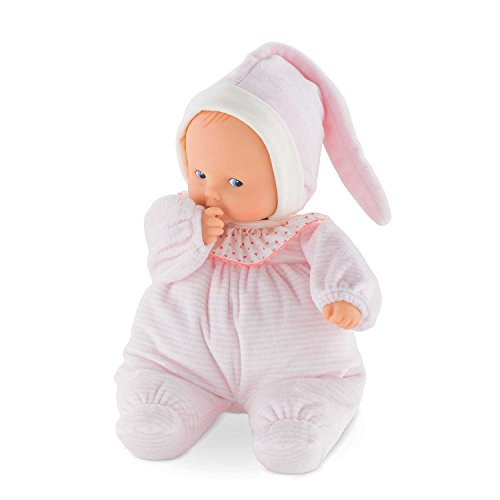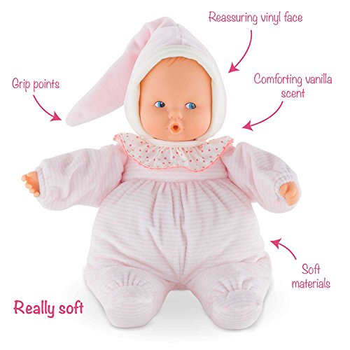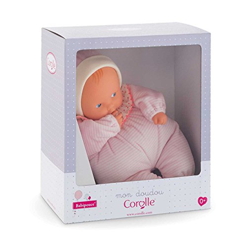 Corolle's Babipouce Pink Striped Doll is a sweet, soft and cuddly first doll that is ideal for ages birth and up. Made with high-quality materials, Babipouce is 11 inches tall and features a pillow-soft body that is easy for tiny fingers to grasp and hug. Designed in France and part of Corolle's Babicorolle Collection, Babipouce offers thoughtful details including sewn-on clothing, plus a smooth vinyl face and hands, all delicately scented with vanilla for sensory appeal. This lightweight, machine-washable doll will quickly become your little one's favorite play companion. With quality fabrics and materials, Babipouce is designed to last. Like all first dolls in the Babicorolle Collection, Babipouce Pink Striped is machine washable (air dry naturally, please).Feature