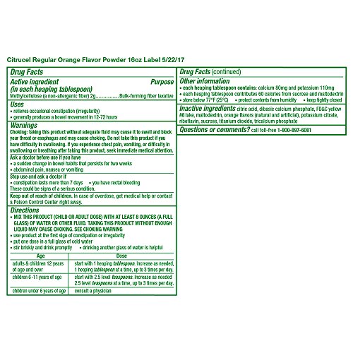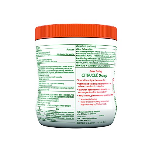 Citrucel with Methylcellulose Fiber is fiber therapy that is clinically proven effective to help relieve occasional constipation. With a great-tasting, easy-to-mix powder, our classic go-to formula gently helps relieve irregularity (When used as directed). Now you can get the fiber you need to help with irregularity without unwanted gas (Based on laboratory testing. Individual results may vary).Feature