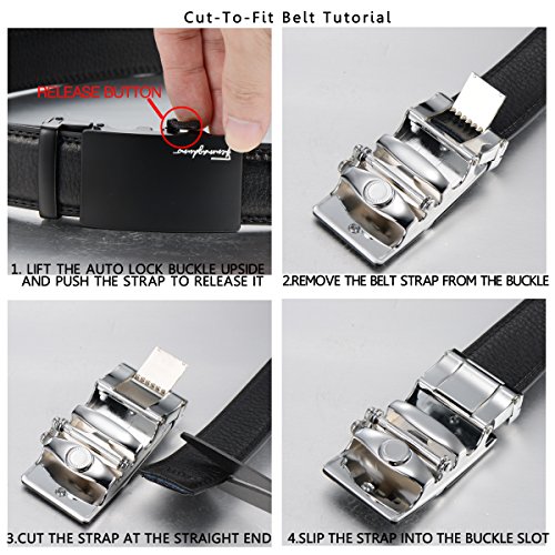 -. Feature : High quality leathers - 100% soft leather belt,all belts are made to be reliable, no glue involved in this belt / Sizes - Belt Length:appr.46inches(119cm)/Width:appr.1.38"(3.5cm)(It's manual measurement,there may be 1-2cm error.),adjustable size up to 44 inches / Ratchet belt - No more holes in the belt!This automatic belt contains a ratchet strip instead of holes.This supports a clean and stylish look at all times, and prodvices a customizable size / Removeable Sliding Buckle - Durable alloy buckle.You can put this buckle on your own belt(3.5cm wide).The gold/silver lasts for a longer time / Men Gift Box - Enclosed in an luxury gift box, best gift for your loved ones