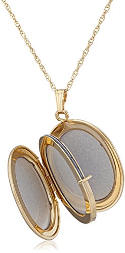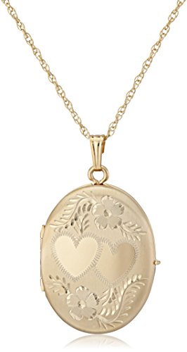 14k gold-filled necklace featuring oval 4-picture locket with hand engraved heart design.
