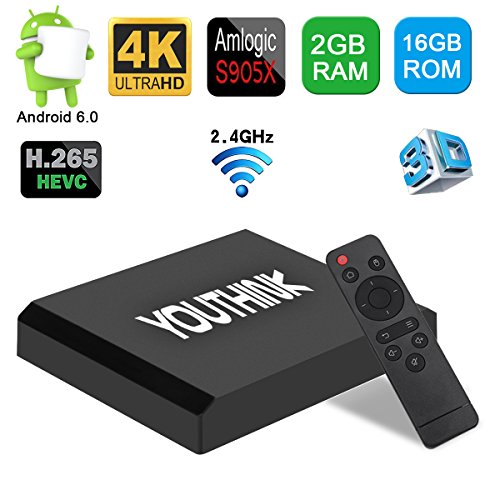 -. Feature : 【Awesome Android 6.0 Performance】: The newest version of TV BOX with Android 6.0 faster, safer, and more efficient! Super mini size but more powerful than any other TV BOX in the market,compatibility with the latest Android applications such as YouTube, Netflix, and many games and support for more USB devices. / 【S905X Chipset Quad-core Speed】: Youthink Android TV Box utilizes the Quad Core CPU Amlogic S905X chip, it runs faster than Amlogic S905, provide a ultra-fast speedin image processing and computing. AX5 could run many games, play unlimited movies, TV shows, music without freezing and buffering. / 【High Compatibility for 4K】: the box is equipped with H.265 decoding technology (save half of band resource yet with better image quality), With the built-in HD 2.0b transmitter and support 4K and HDR10, come with HD, make sure you can enjoy 4Kx2K movies,provide you the most upgrade ability on viewing experience. / 【High-Level Configuration】: DDR3 2G RAM + eMMC 16G ROM memory provides plentiful room,higher running speed, without buffering or breaking down,quickly start your apps and games.32G Max Extended Capacity brings you more space to browse helpful websites, play exciting games and listen to beautiful music. / 【One Year Warranty】: This item is backed by an 1 year Youthink warranty. Anytime you have question during usage, please feel free to contact us, our technical team provide you professional problem-address solutions.