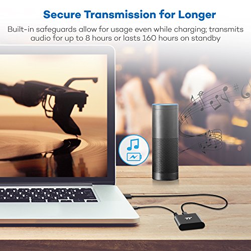 Secure Transmission for Longer As a Bluetooth Transmitter, the TaoTronics TT-BA11 lasts up to 8 hours when streaming audio and a whopping 160 hours on standby. When the battery’s finally empty, you can still use it while charging thanks to a series of internal safeguards.