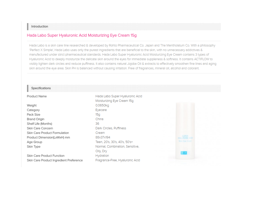 Hada Labo Super Hyaluronic Acid Moisturizing Eye Cream contains ACTIFLOW, an intense hydrating ingredient, which is the solution to visibly lightens dark circles and reduce puffiness and fine lines.