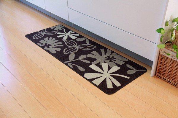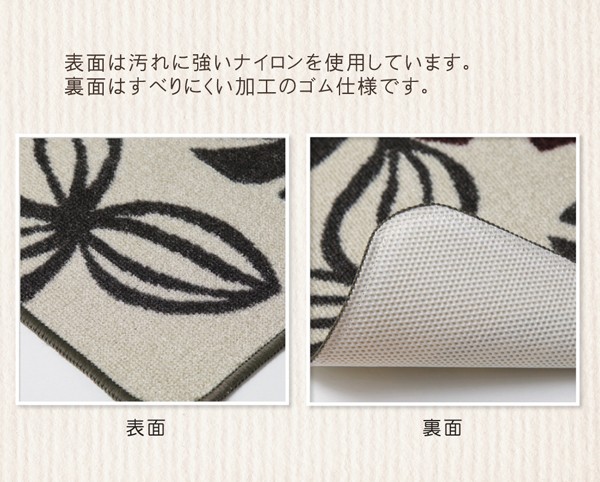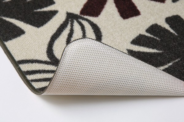 モノクロなリーフ柄をあしらったカジュアルなキッチンマットです。表地にはナイロンを使用しています。ナイロンには強度があり摩耗に強いという耐久性に優れた面や、汚れが落ちやすく速乾性があるなどのマットに適した特徴があります。裏面にはすべりにくい加工を施しています。