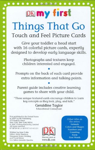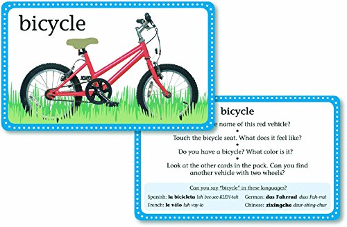 Featuring objects that babies love including cars, busses, boats, hot air balloons, and more My First Touch and Feel Picture Cards: Things That Go contain photographs and textures on the front of the cards to keep young children engaged, while the back of the cards have related questions for additional talking points. In addition to English, each card includes pronunciations in Spanish, French, German and Chinese. A parents' guide that contains ideas for simple and advanced games to enhance the learning experience rounds out the package.