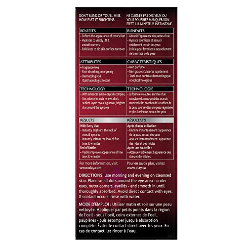 -. Brand : Olay -. Feature : Reduces crows feet in 2 weeks / Gentle, non-greasy eye serum penetrates deep to fight tired-looking skin / Concentrated amino-peptide + B3 complex provides deep hydration to firm and visibly lift the area around the eyes / Leaves the skin around your eyes feeling velvety smooth -. Label : Olay -. Manufacturer : Olay -. PackageQuantity : 1 -. ProductGroup : Kitchen -. ProductTypeName : KITCHEN -. Publisher : Olay -. Studio : Olay -. Title : Olay Regenerist Eye Lifting Serum