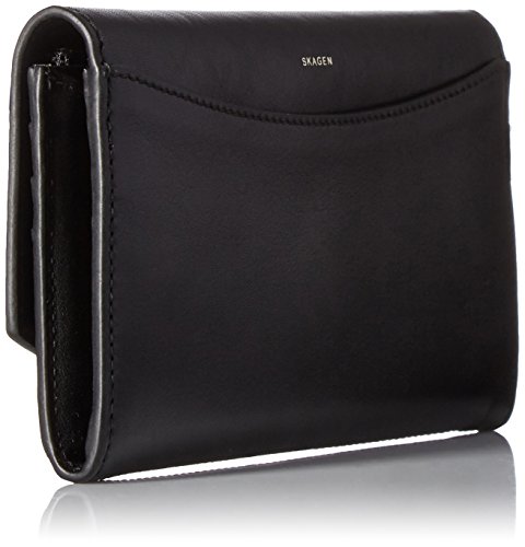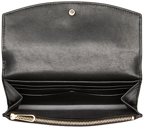 The snap-button flap of the continental flap wallet opens to reveal 12 credit card slots, a zip pocket and a bill slot, while the exterior features a slip pocket large enough for a smartphone.
