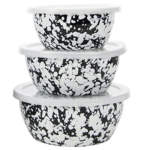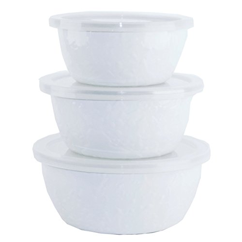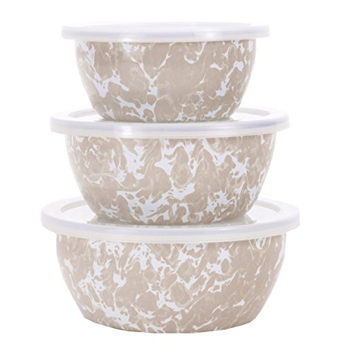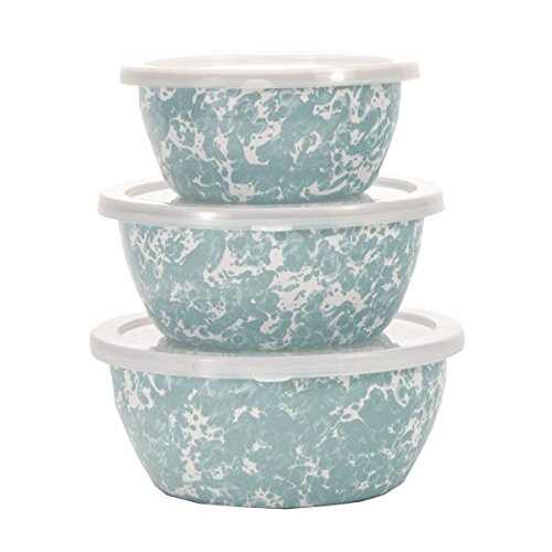 Golden Rabbit 7"x7"x7" Sea glass enamelware nesting bowls. This enamelware is made of carbon steel coated with a porcelain enamel and trimmed in stainless steel. There will be variations in the shading of colors and pattern formations which are the results of the hand-dipped process. Golden Rabbit enamelware is created using a traditional handmade production method that has changed very little since the late 18th century. Each piece is hand-dipped and fired at extremely high temperatures causing the steel to Contract and fusing the porcelain enamel to the steel, creating a durable, non-porous surface.Feature