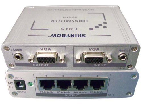 Studio : Shinybow Publisher : Shinybow Binding : Electronics Product Description CAT5 VGA Video Splitter Extender extends video signals up to 300 meters (1000ft) using inexpensive CAT5 / CAT6 UTP cable. A video extender consists of both a transmitter and receiver. The transmitter connects to your local video source and allows you to extend to a single or multiple remote receivers. Cat5 component video Splitter extender via Cat5 is the ideal solution for applications to display the same image on multiple remote locations. These AV splitter extenders are commonly used at restaurants, bars, clubs and other HDTV environments for video broadcasting such as remote monitoring, presentations and advertising. Please note VGA Remote Receivers are not included and must be purchased separately along with the Splitter/Extender for correct functionality. Product Features : - VGA RGBHV Video and Audio CAT5 Transmitter