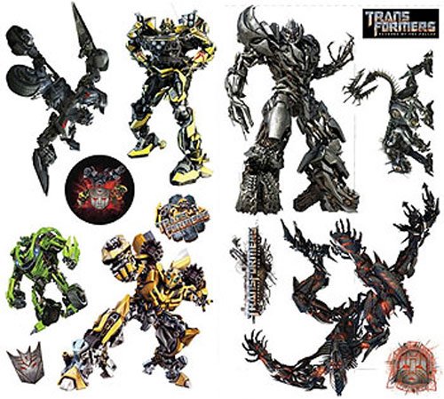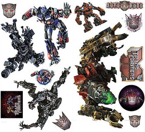 27 quality licensed decals.This set of stickers features characters from the Transformers Revenge of the Fallen movie including Optimus Prime, Bumblebee, and the Fallen. Use these large pre-cut wall appliques to create that unique accent for your room or car in minutes! They are instantly removable and reusable with no damage or residue to the wall! Sticks equally well in the bathroom, onto your car, truck, kitchen tiles or furniture! CONTENTS: 27 wall decor stickers/decals of varying sizes, the largest being 13.5 inches X 6.5 inches (30.48 X 22.23 cm) and the smallest 2.0 inches X 2.0 inches (5.08 X 5.08 cm)
