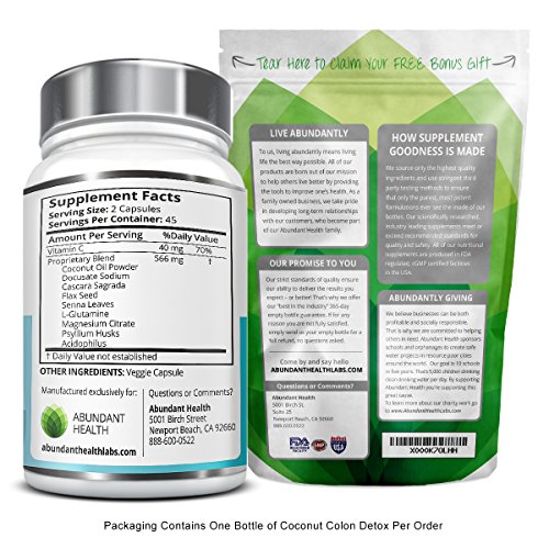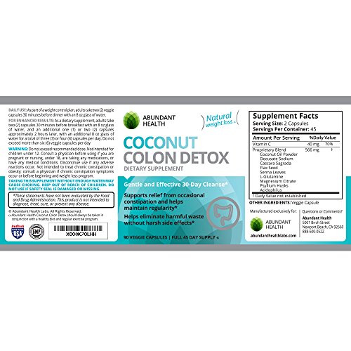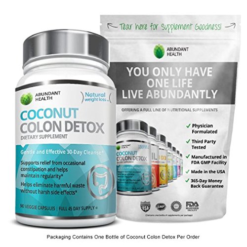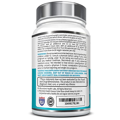- Feature : USE THE POWER OF SCIENCE TO DETOX NATURALY! Our high fiber Coconut Colon Detox is specially formulated to assist with digestive problems. Manufactured in an FDA non-GMO USA based laboratory / PURE, POWERFUL AND POTENT! No need for a Perscription! Abundant Health's Super Colon Cleanse Detox Formula is safe, natural, and effective. Just a few capsules a day will help cleanse your colon, aid in kidney and liver detox, boost your diet by enhancing your metabolism, and eliminate poisonous waste from your body. Our ultra blend pills deliver max benefits, such as restored energy, weight loss and fat burn, and improved vitamin and mineral absorption / CLEANSE WITHOUT COMPROMISING COMFORT - Unlike other, lower quality brands, you will enjoy a gentle, painless, and natural detoxification safe enough to use every day - BEST ON THE MARKET - The only super colon cleanse on the market that utilizes the benefits of a premium formula blend of quality herbs and ingredients such as psyllium husk, aloe, and 100% natural coconut oil powder which is considered "Nature's Natural Laxative" because coconut is so rich in fiber! / LOSE BODY WEIGHT - FEEL GREAT! - Detoxifying your colon through our supreme quality formula is a great, cheap way to supplement your diet. Your colon can have up to 10 Pounds of backed-up, fecal matter, accumulating for weeks, months, or even years, making a cleanse ideal for weight loss!! This toxic waste could be the cause of all kinds of harmful issues impacting your health, including feelings of weakness and sluggishness as the waste accumulates. A detox clease can restore your energy to a healthy level and help you sculpt your body. To boost all natural weight loss, we recommend a regularly scheduled Coconut colon cleanse as part of an everyday routine for men and for women. / 30 DAY DETOX - Best Value For Your Money - Compare our product to other brands that falsely offer super quick, one day cleanses that are likely to leave you with cramps, bloating, diarrhea, or constant trips to the bathroom. The science behind the human body guided our choice to be the first to make coconut the foundation of our colon cleanse product due to its natural high fiber content. BEST QUALITY ON AMAZON - Abundant Health does not compromise on ingredients or quality control. All of our supplements are manufactured in a USA GMP Certified Facility and Third Party Tested for Purity.