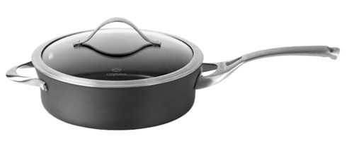 Keep it simple with versatile equipment. This 5-quart nonstick saute pan has a capacity indicator line on the rim, making it easy to bring straight from the kitchen to the table. Saute vegetables, lean cuts of meat and more in this versatile pan. Made of heavy-gauge aluminum, it has an anodized exterior, durable nonstick interior for healthy, low-fat cooking, ergonomic handle that stays cool during stovetop cooking and durable tempered glass lid that nestles within for a clean look. The stainless steel band adds style and functionality - there are less crevasses for food to get stuck in. Branded with Calphalon logo.Feature