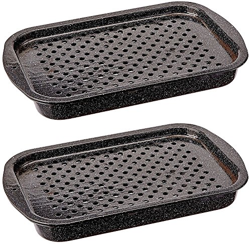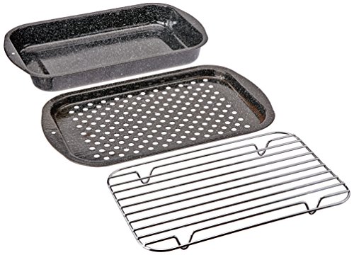 The Granite Ware 3 pc Bake, Broil and Grill features a perforated tray that is ideal for vegetables or fish. Use it directly on the barbecue or in the oven at home. The grill rack can be used to broil meat in the oven using the pan bottom to catch the drippings and keep your oven clean. The base pan can be used by itself as a Roasting pan or Lasagna pan. Cook and serve right out of the pan